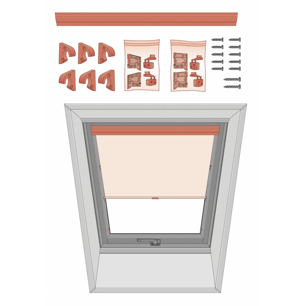 means of protection against sunlight for users of roof windows: VELUX, FAKRO, RoofLITE or OptiLight. Three pairs of fastenings allow the blind to be fixed in different positions. The fabric is rolled up on a roller with the spring. It is equipped with an elegant aluminium fascia, which hides the roller.