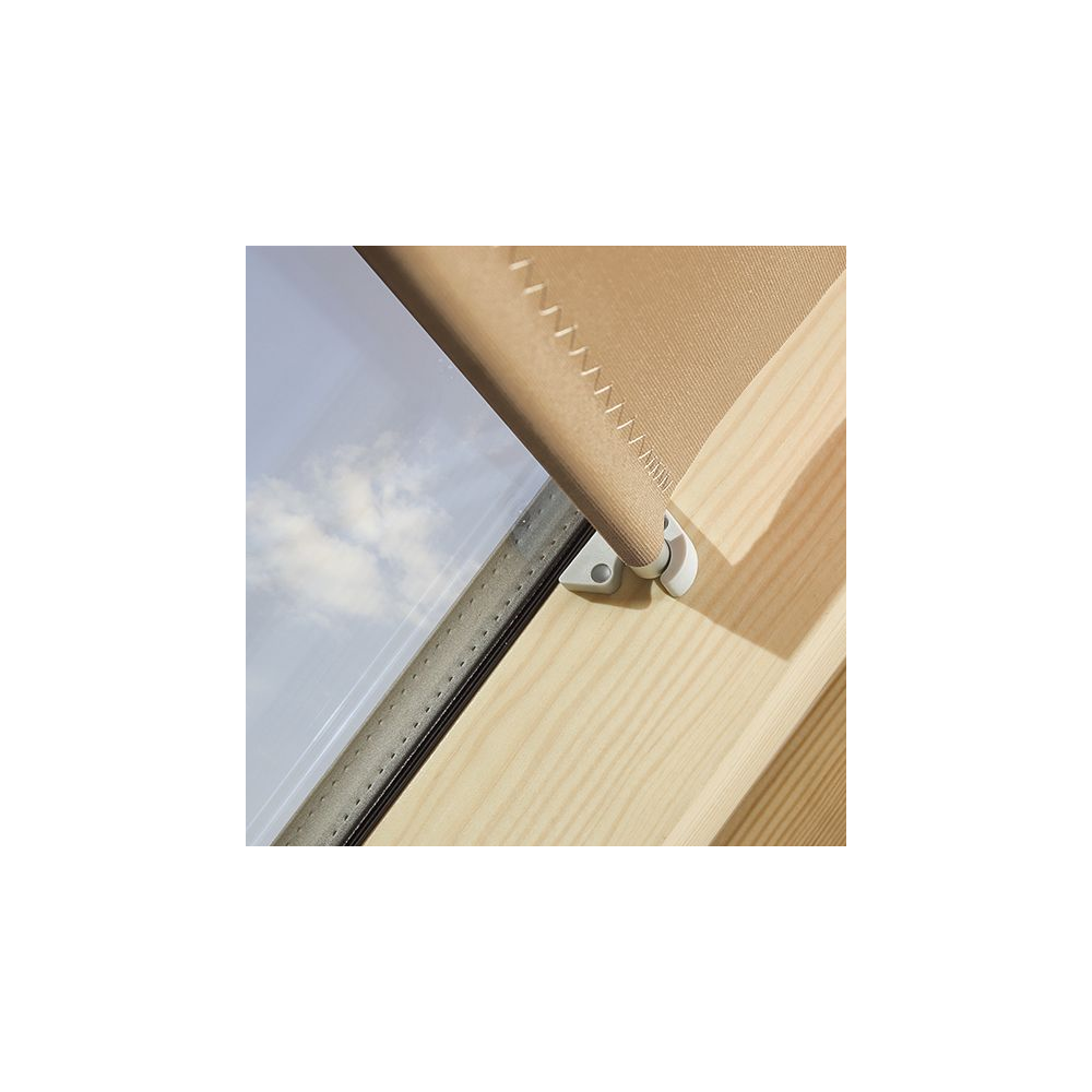 means of protection against sunlight for users of roof windows: VELUX, FAKRO, RoofLITE or OptiLight. Three pairs of fastenings allow the blind to be fixed in different positions. The fabric is rolled up on a roller with the spring. It is equipped with an elegant aluminium fascia, which hides the roller.