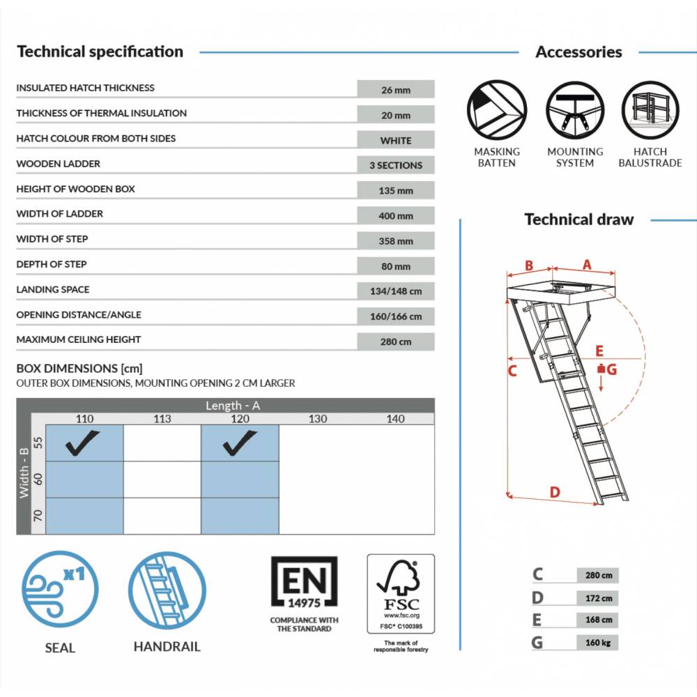 The Termo 55cm x 110cm wooden loft ladder is an excellent choice. Made of durable materials, capable of carrying up to 160 kilograms safely, and safely and easily operable, it is an amazing option that you need to consider!