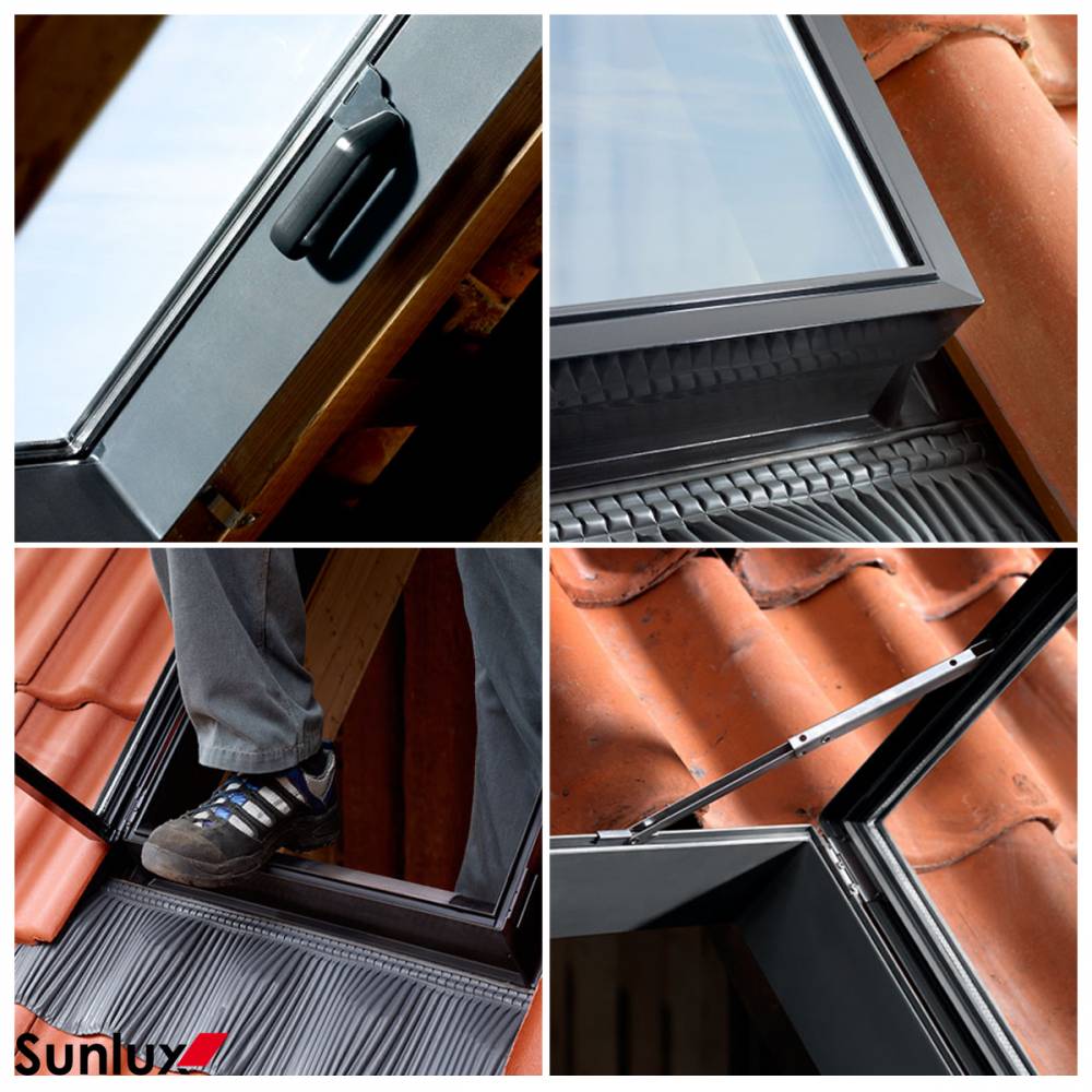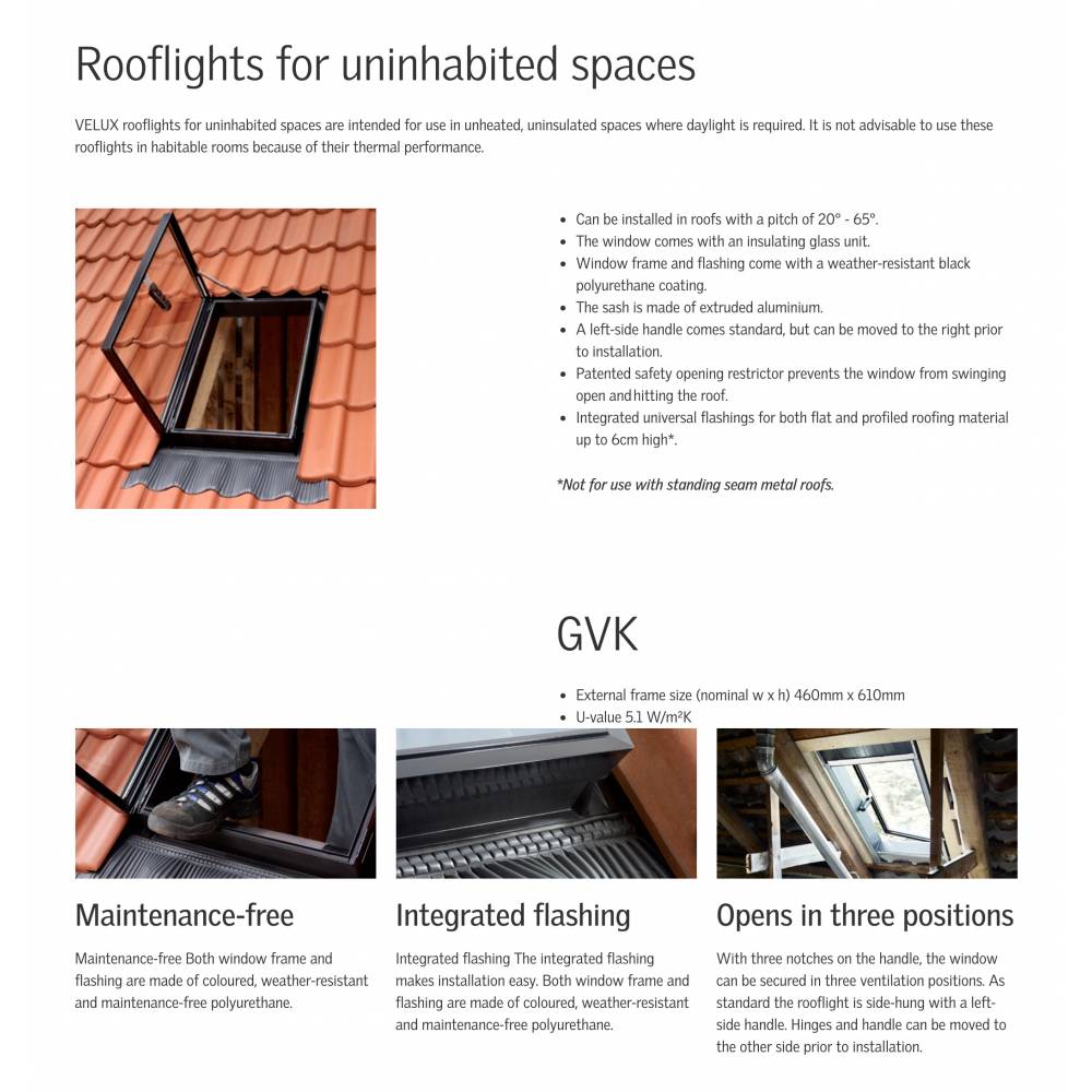 VELUX GVK 0000Z windows are designed for use in unheated uninhabited rooms where easy access to the roof and regular ventilation is needed. Side-hung, it opens to the left or right depending on your preference. The window is made from maintenance-free aluminium and polyurethane. It is not advisable to use these rooflights in habitable rooms because of their thermal performance.